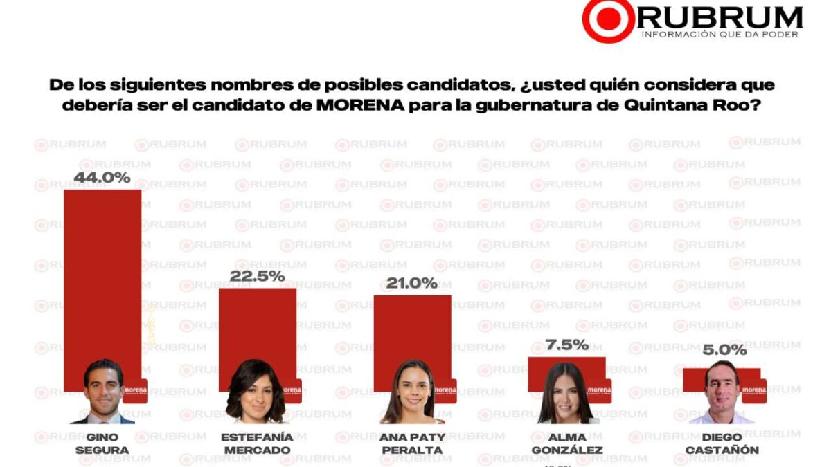 De acuerdo con la más reciente medición de la casa encuestadora Rubrum, los perfiles de Gino Segura y Estefanía Mercado encabezan las preferencias al interior de Morena rumbo a la definición de su candidatura para la gubernatura de Quintana Roo en 2027.