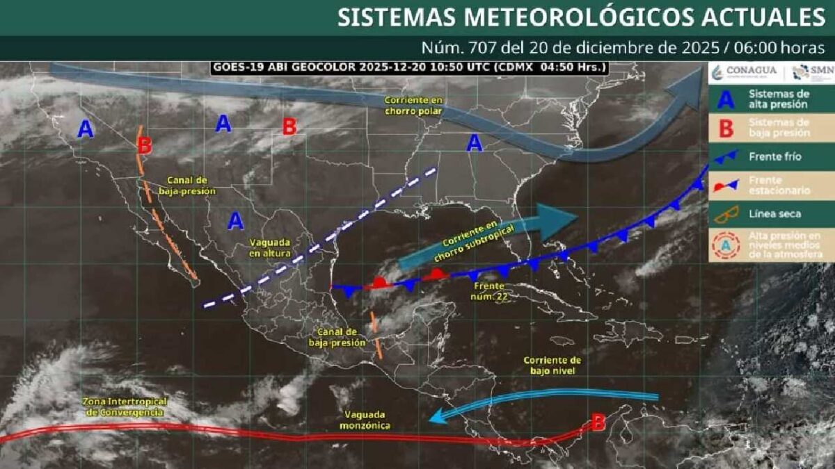 El frente frío número 22 dejará de afectar al país al desplazarse hacia el oriente del Golfo de México. Sin embargo, una vaguada en altura y un canal de baja presión, junto con la entrada de humedad del mar Caribe, mantendrán condiciones inestables en el sureste mexicano y la Península de Yucatán, incluyendo el sur y sureste de Quintana Roo.