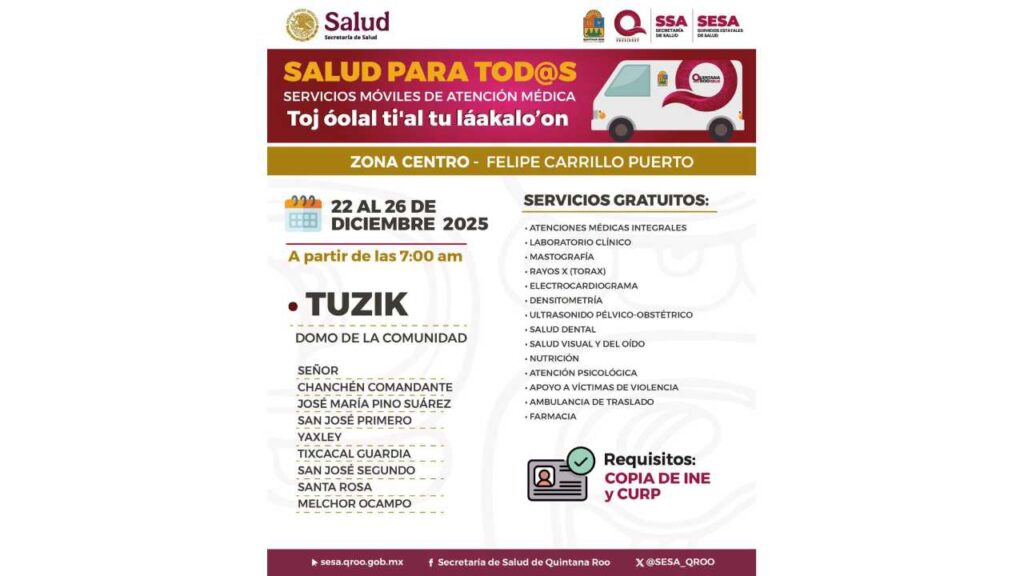 En esta Semana de Navidad, las caravanas de Salud recorrerán tres municipios de Quintana Roo con el objetivo de acercar servicios médicos gratuitos a la población, fortaleciendo la atención preventiva y el bienestar comunitario en diversas localidades del estado.