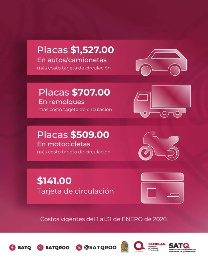 El Gobierno de Quintana Roo, a través del Servicio de Administración Tributaria del estado (SATQ), dio a conocer los costos oficiales y los requisitos actualizados para el canje de placas vehiculares, vigentes del 1 al 31 de enero de 2026.