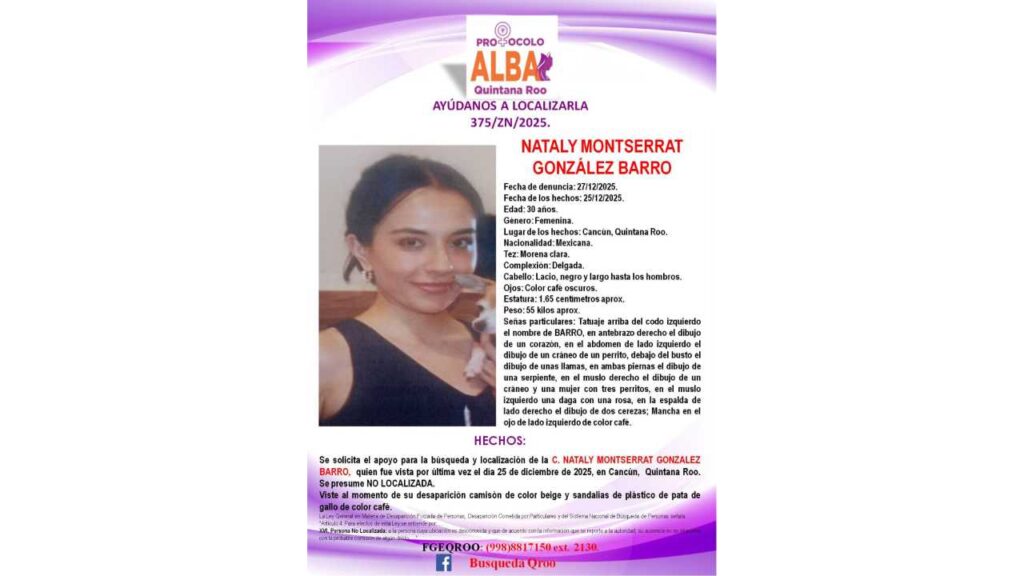 Nataly Montserrat fue vista por última vez la noche del 25 de diciembre en Cancún, lo que detonó una intensa difusión del caso en redes sociales.