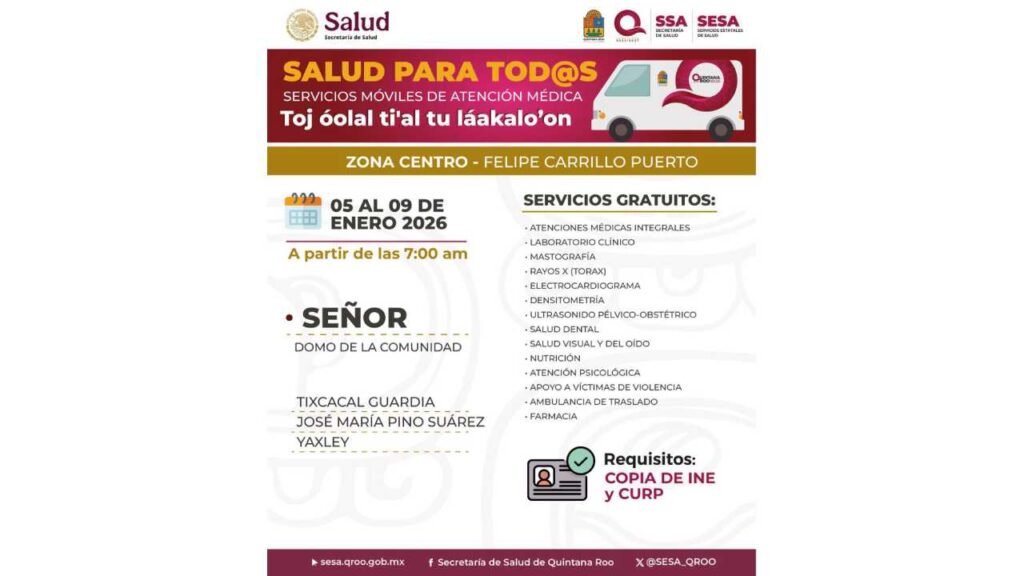 Las caravanas móviles de salud continúan su recorrido por Quintana Roo como una estrategia para garantizar el acceso a servicios médicos gratuitos, especialmente en comunidades con mayor rezago social. Durante esta primera semana del año, las unidades médicas estarán brindando atención directa a la población en municipios del sur y centro de la entidad.