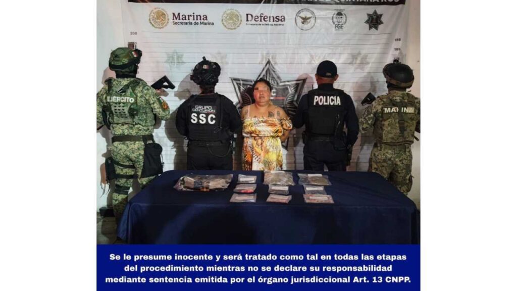 En un segundo operativo, en el fraccionamiento Villas del Sol, en Playa del Carmen, fue detenida Yesy Nohemí “N”, quien presuntamente manipulaba diversas bolsitas con sustancias ilícitas.