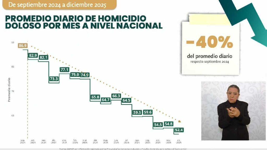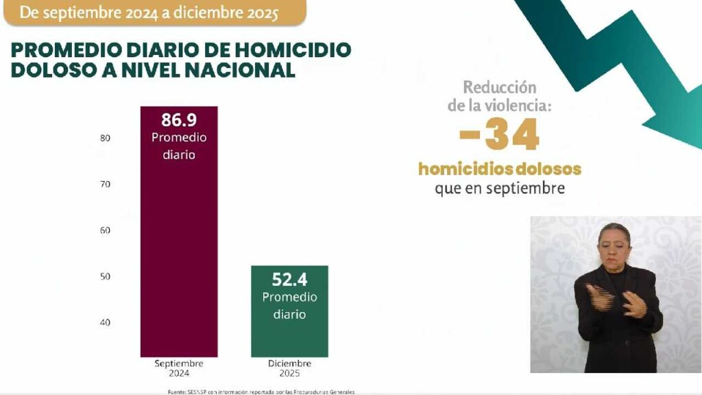 Por su parte, Marcela Figueroa Franco, titular del SESNSP, detalló que la actual administración inició con un promedio de 86.9 homicidios diarios y cerró diciembre de 2025 con 52.4 casos diarios.
