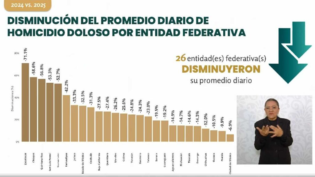 Los estados con la mayor reducción de homicidios entre 2024 y 2025 fueron: