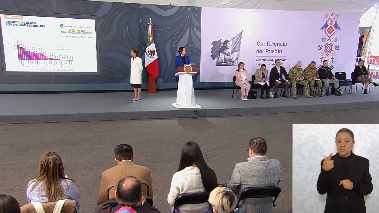 Durante la Mañanera del Pueblo realizada en el estado de Morelos, la presidenta Claudia Sheinbaum Pardo destacó que, a nivel nacional, los homicidios dolosos registraron una disminución del 40% entre septiembre de 2024 y diciembre de 2025, alcanzando el nivel más bajo desde 2016.