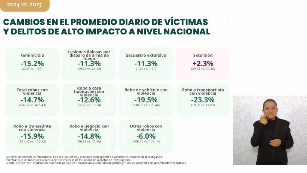 Marcela Figueroa Franco añadió que la mayoría de los delitos de alto impacto registraron una baja entre 2024 y 2025, con excepción de la extorsión, que presentó un incremento de 2.3%.