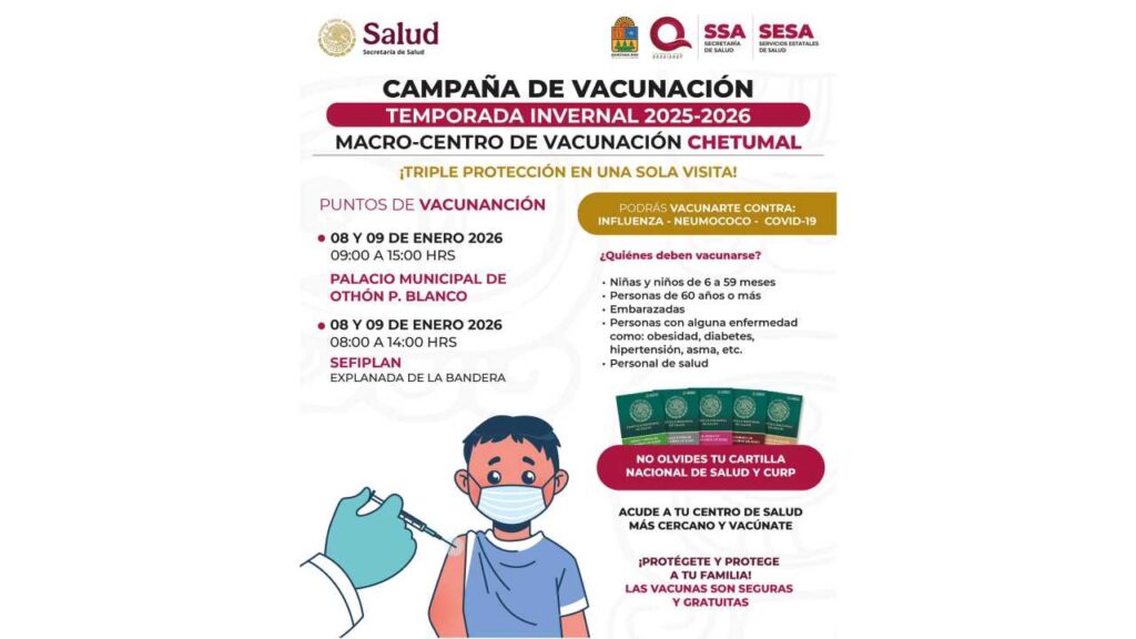 La campaña de vacunación de la temporada invernal continúa vigente en Chetumal, como parte de las acciones preventivas para proteger a la población ante enfermedades respiratorias.