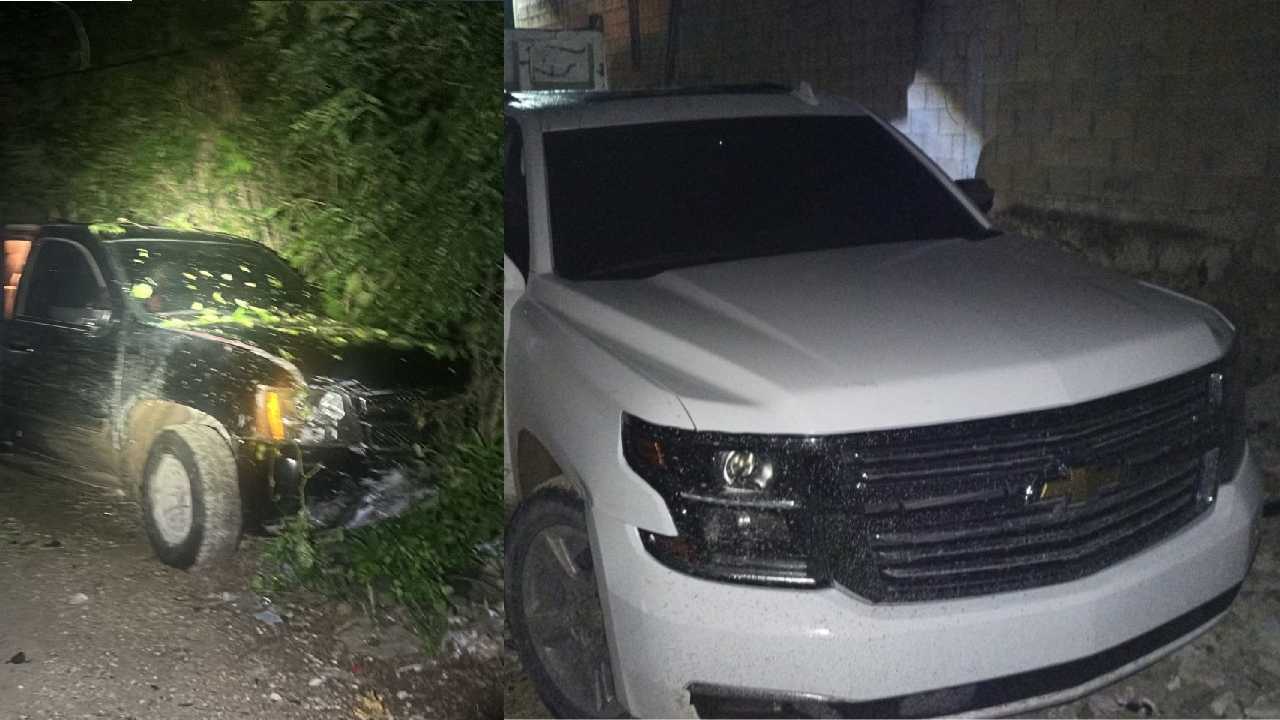 A pesar de que los sospechosos lograron escapar, los elementos de seguridad aseguraron dos unidades tipo Suburban, una de color negro y otra blanca; esta última contaba con predenuncia de robo.