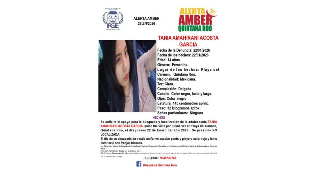En un segundo caso, se activaron alertas por la desaparición de Tania Amahirani Acosta García, de 14 años, vista por última vez el 22 de enero de 2026 en Playa del Carmen.