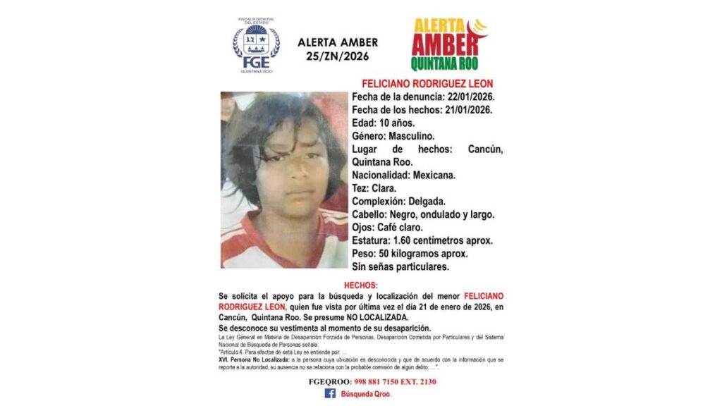 Como parte de las alertas vigentes, la FGE emitió ficha de búsqueda para Feliciano Rodríguez León, de 10 años, visto por última vez el 21 de enero de 2026 en el municipio de Benito Juárez (Cancún).