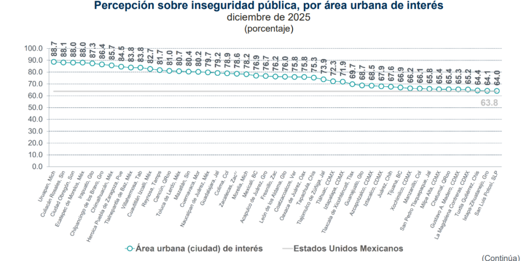 En diciembre de 2025, 63.8% de la población mexicana de 18 años y más consideró inseguro vivir en su ciudad, de acuerdo con la Encuesta Nacional de Seguridad Pública Urbana (ENSU) del Inegi. Aunque el indicador se mantuvo estable respecto a septiembre de 2025, sí mostró un incremento estadísticamente significativo frente a diciembre de 2024, cuando se ubicó en 61.7% .