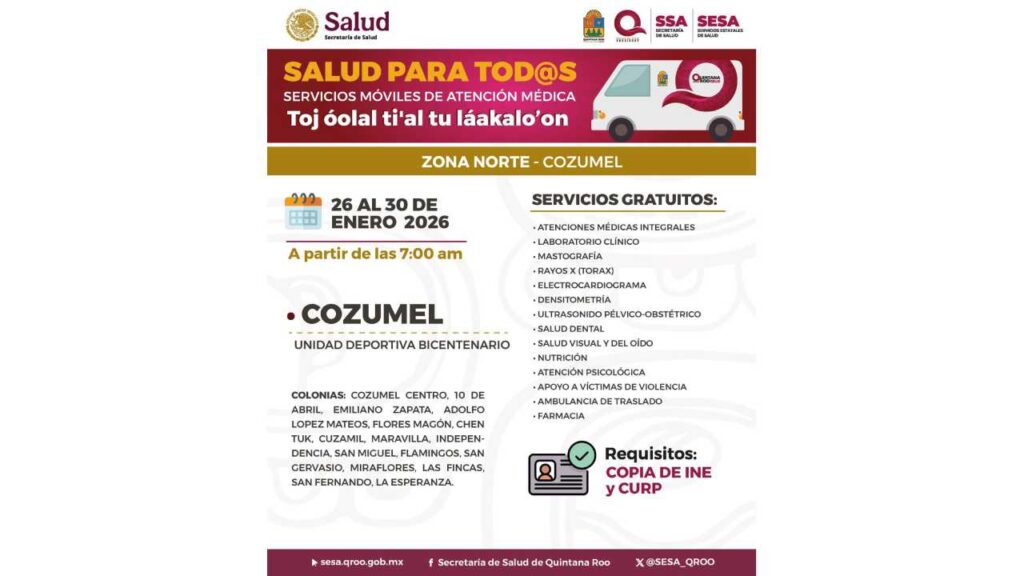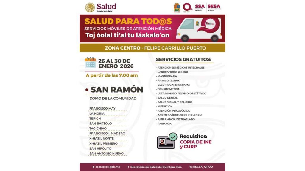 A partir de este lunes 26 de enero de 2026 las caravanas de salud inician con sus servicios en comunidades de los municipios de Cozumel, Othón P. Blanco y Felipe Carrillo Puerto, Quintana Roo.