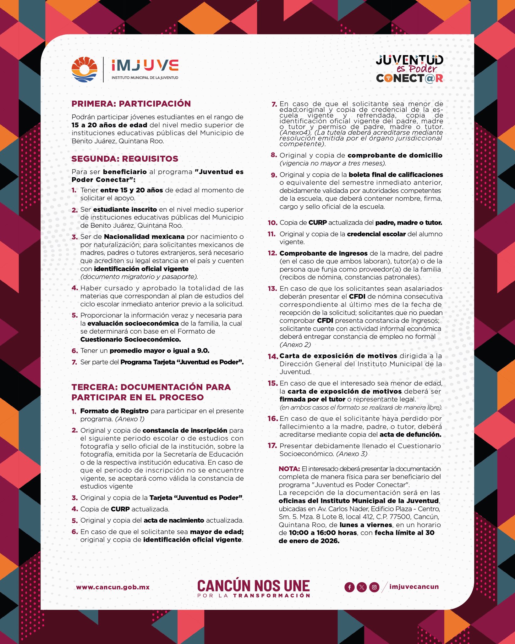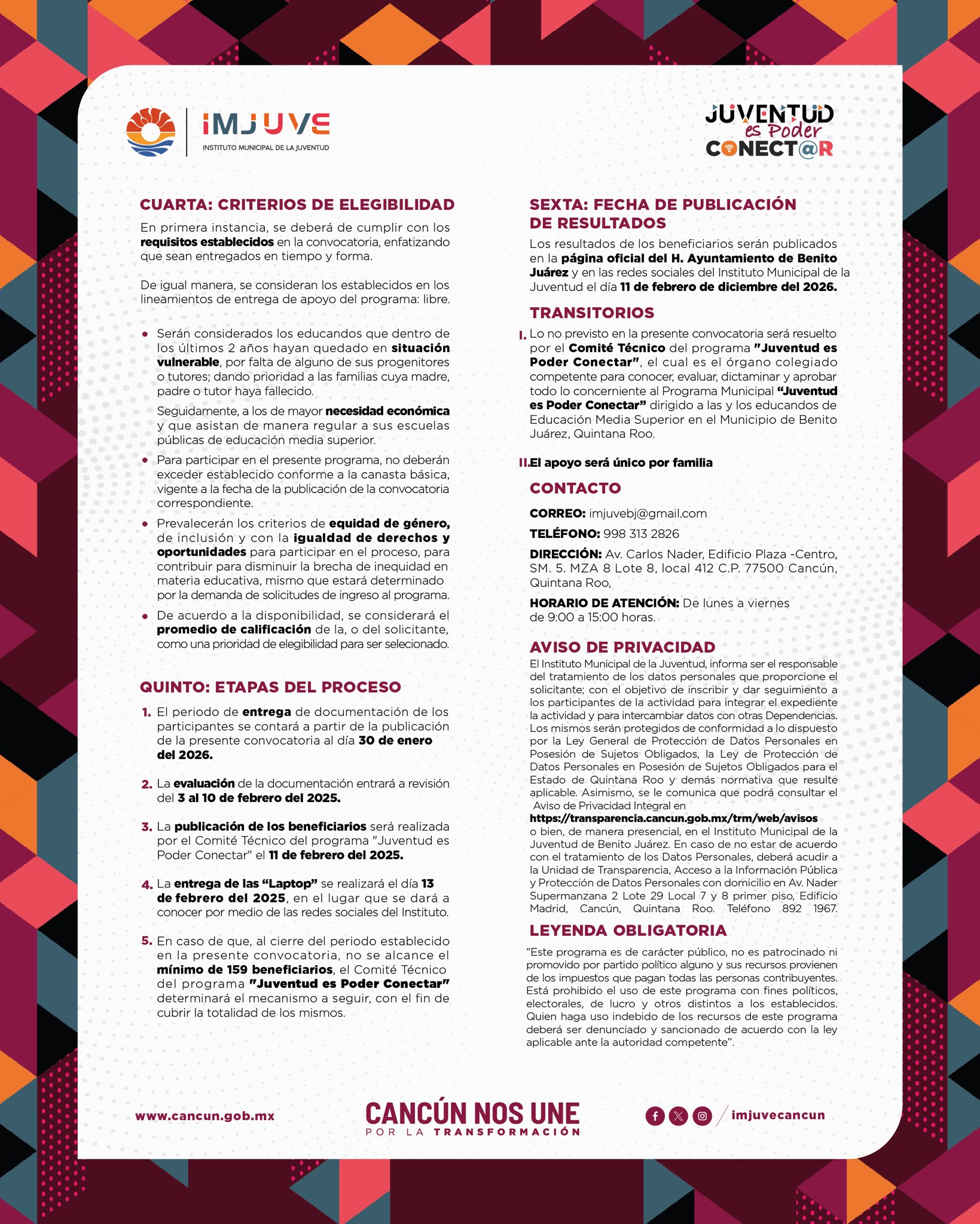 - Sitio web: cancun.gob.mx/convocatorias