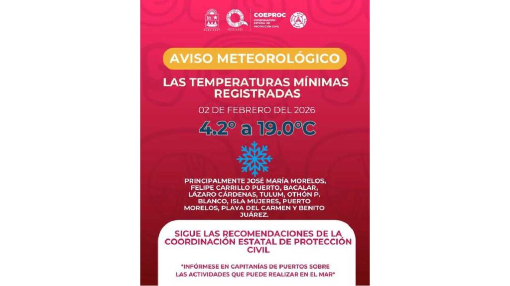 El ingreso de una intensa masa de aire ártico provocó en Quintana Roo uno de los descensos de temperatura más pronunciados de los últimos años, con efectos generalizados en gran parte del territorio estatal, principalmente en las regiones centro y sur.