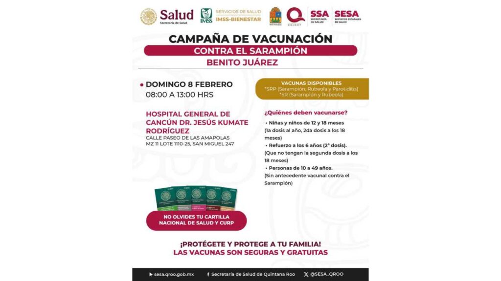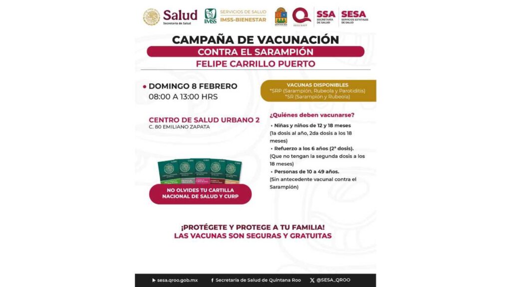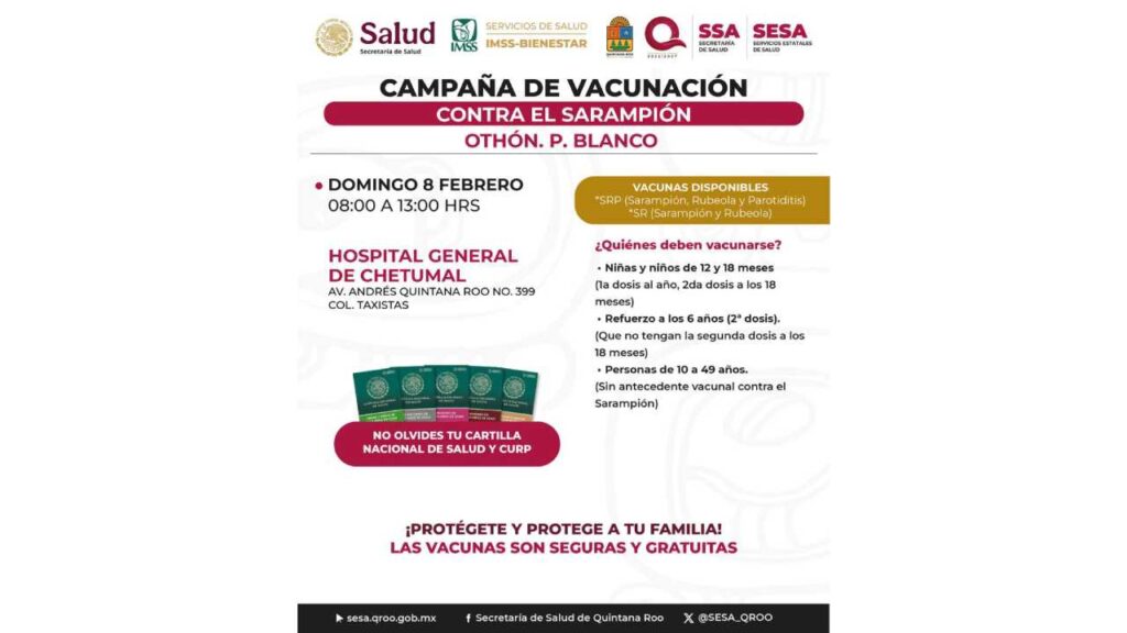 Finalmente recordar que la Secretaria Estatal de Salud (SESA), intensificó en días pasadoa su campaña de vacunación luego de comprobar seis casos de sarampión en Quintana Roo, entre esos unos gemelos de 10 años de edad.