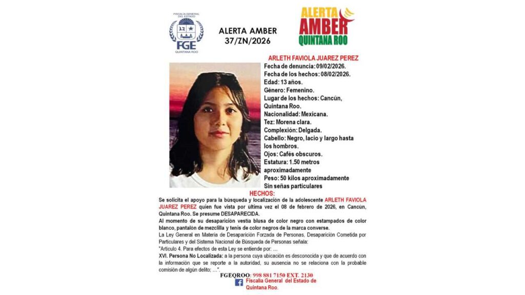 Las alertas por desaparecidos fueron activadas por la Fiscalía General del Estado de Quintana Roo en el municipio de Benito Juárez, donde se emitieron fichas de búsqueda para tres personas, entre ellas una menor de edad.