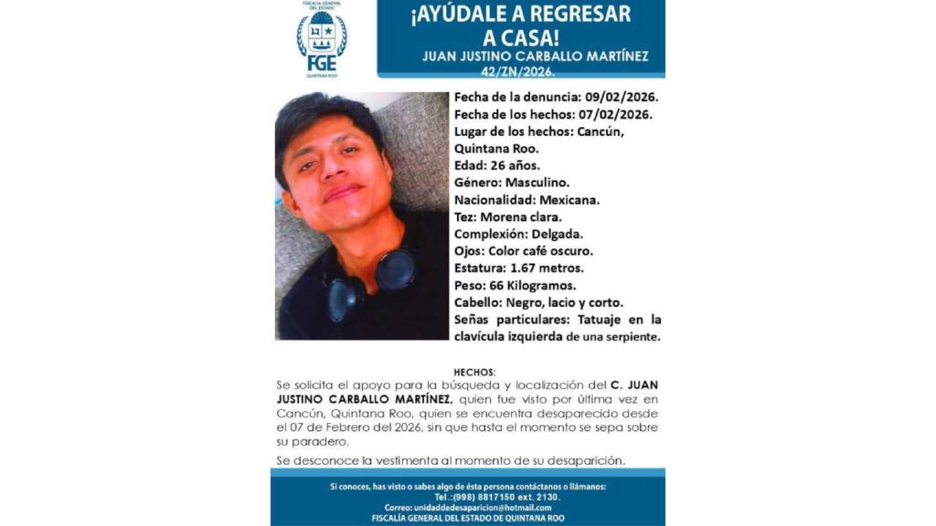 La FGE activó alerta para la localización de Juan Justino Carballo Martínez, de 26 años, visto por última vez el 7 de febrero de 2026 en Cancún.