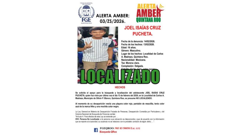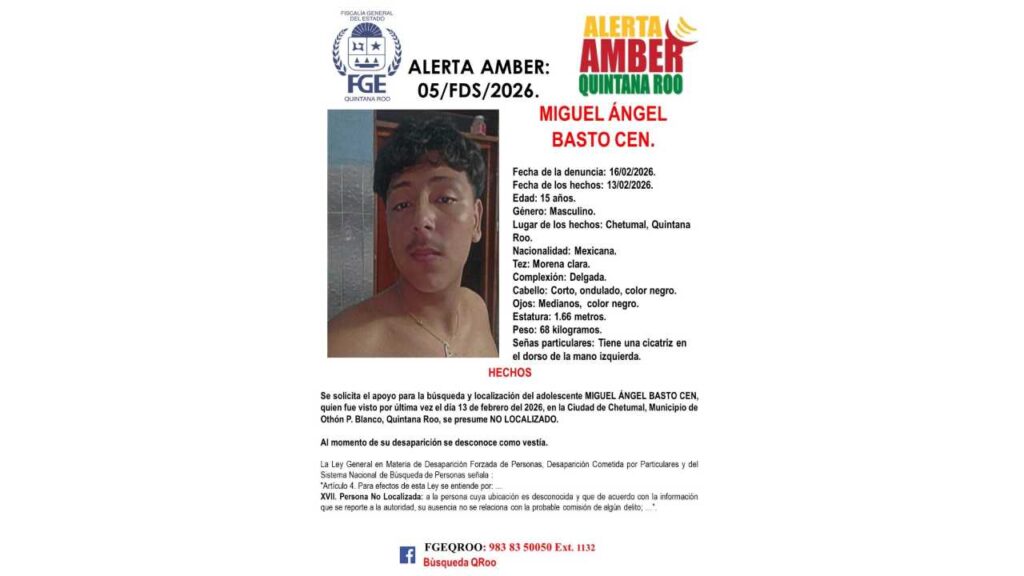 La fiscalía informó que se trata de Pedro Martínez Pascual, de 13 años, visto por última vez el 13 de febrero de 2026 en Playa del Carmen, y de Miguel Ángel Basto Cen, de 15 años, desaparecido el mismo día en Chetumal.