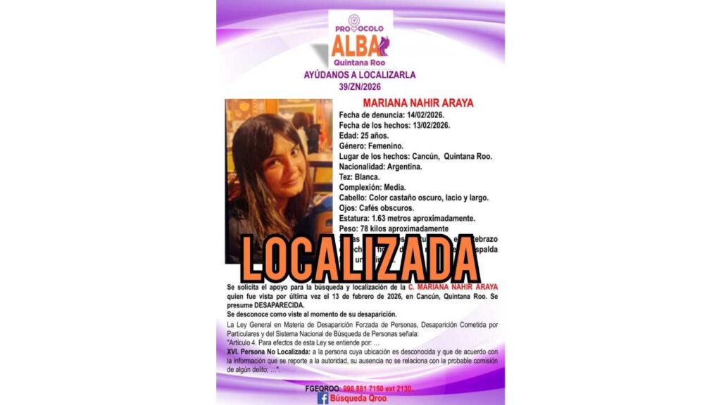 La Fiscalía General del Estado de Quintana Roo activó fichas de búsqueda para localizar a dos menores de edad reportados como desaparecidos en distintos municipios de la entidad, mientras que confirmó la localización de una joven de nacionalidad argentina.