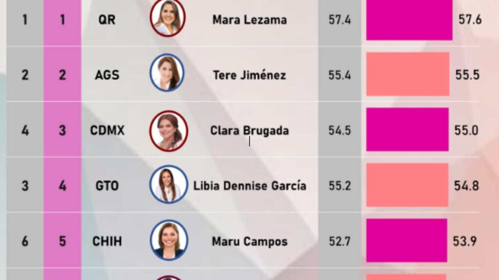 Además de liderar la evaluación general, se mantiene como la única mujer en ocupar la primera posición del ranking global. Dentro del bloque de gobernadores emanados de Morena y sus aliados, también encabeza la medición, fortaleciendo su posicionamiento político a nivel nacional.