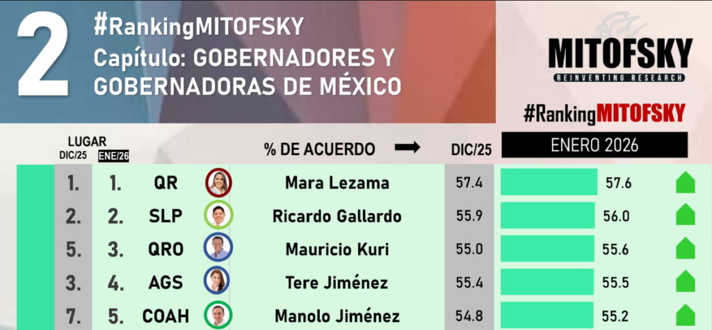 La gobernadora de Quintana Roo, Mara Lezama Espinosa, comenzó 2026 como la mandataria estatal con mayor respaldo ciudadano en México, de acuerdo con el más reciente ranking mensual de Consulta Mitofsky correspondiente a enero.