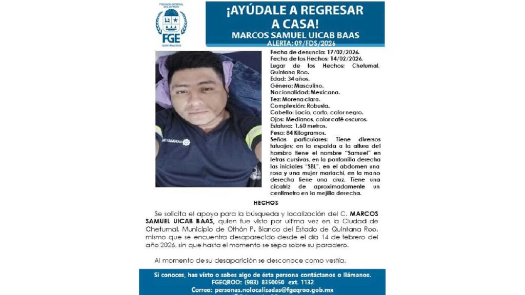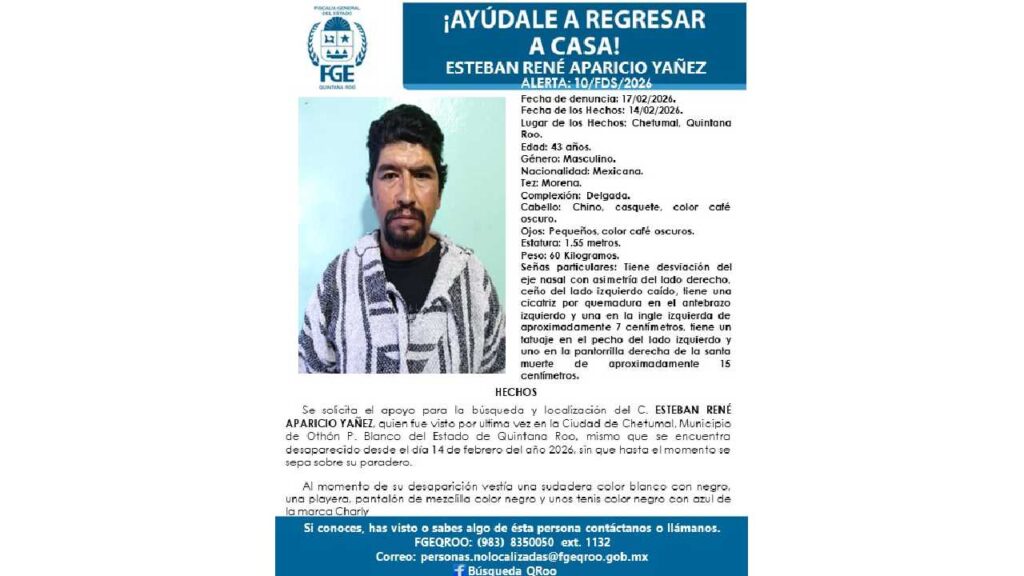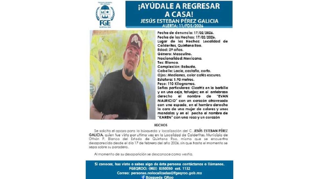 La Fiscalía General del Estado de Quintana Roo informó la emisión de alertas para Jesús Esteban Pérez Galicia, de 29 años, visto por última vez el 17 de febrero en Calderitas; Esteban René Aparicio Yañez, de 43 años, y Marcos Samuel Uicab Baas, de 34, ambos reportados como desaparecidos en Chetumal.