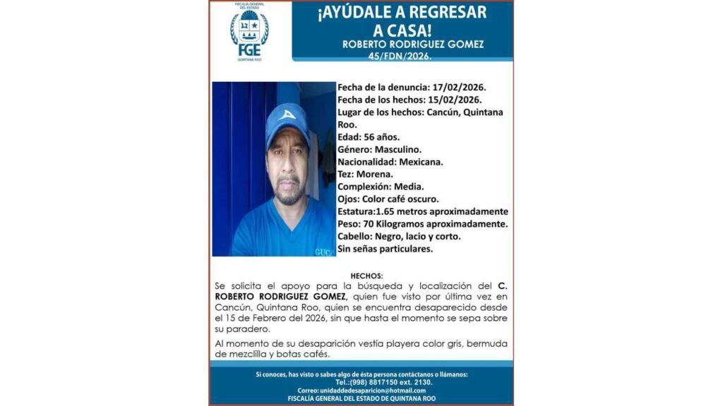 En un hecho distinto, la autoridad activó una alerta por Roberto Rodríguez Gómez, de 56 años, quien fue visto por última vez el 15 de febrero en Cancún, municipio de Benito Juárez.