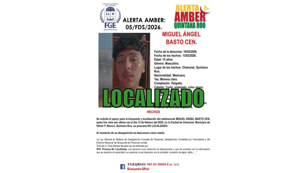 La dependencia estatal también informó la desactivación de una ficha tras la localización de Miguel Ángel Basto Cen, agradeciendo la colaboración ciudadana.