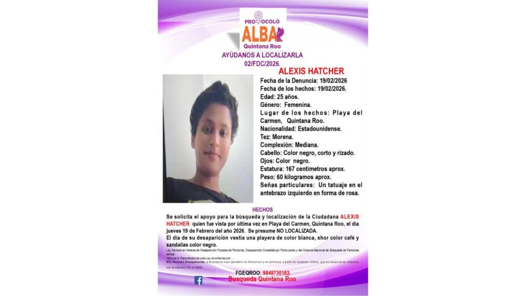 En el primer caso, se emitió ficha por Alexis Hatcher, vista por última vez en Playa del Carmen, municipio de Playa del Carmen.