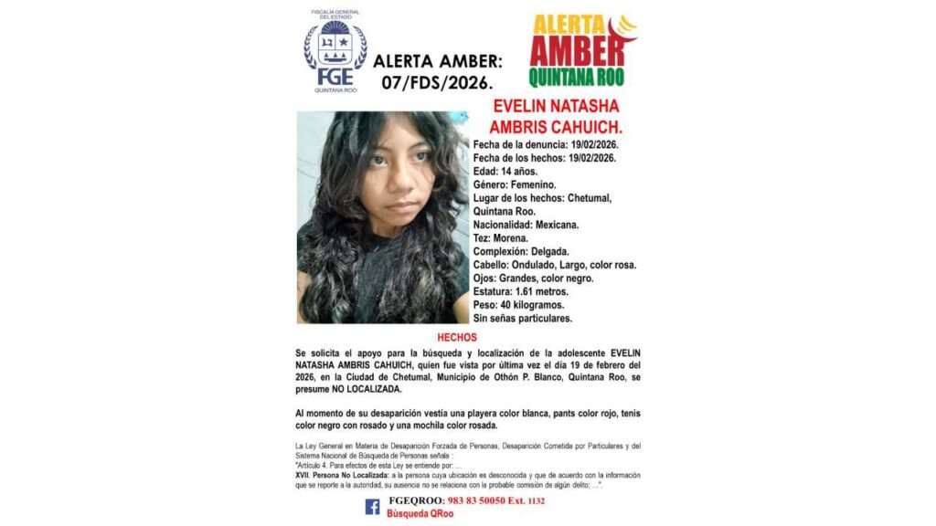 También se activó Alerta Amber por Evelin Natasha Ambris Cahuich, de 14 años, vista por última vez en Chetumal, municipio de Othón P. Blanco.