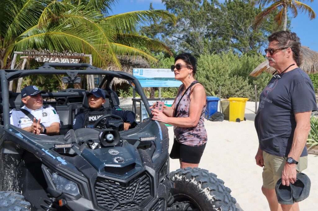 A través de la Secretaría de Seguridad Ciudadana de Playa del Carmen, el municipio despliega elementos durante el día en playas públicas, incluidas aquellas con certificación ambiental internacional.