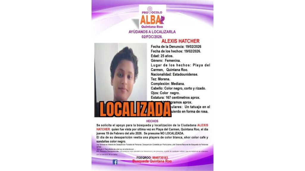 La Fiscalía también confirmó la desactivación de la ficha de búsqueda de Alexis Hatcher, menor originaria de Estados Unidos, reportada en Playa del Carmen, quien ya fue localizada.