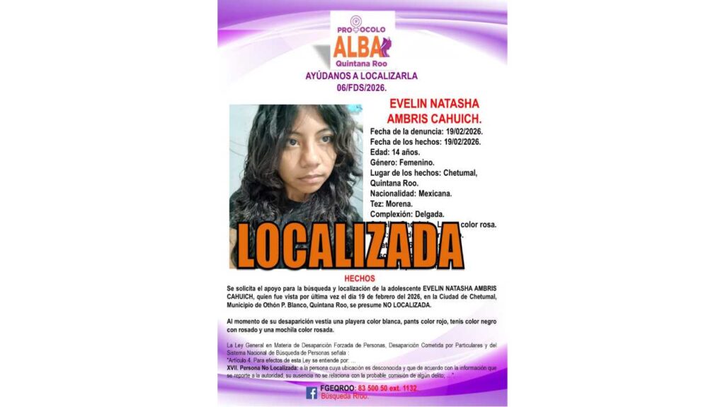 Asimismo, fue encontrada Evelin Natasha Ambris Cahuich, reportada como desaparecida en Chetumal. En ambos casos, las autoridades agradecieron el apoyo ciudadano.