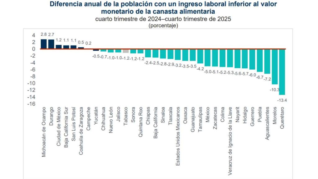 En contraste, 24 estados reportaron incrementos anuales en el ingreso laboral real per cápita, destacando Querétaro (22.1%), Morelos (20.2%) y Sonora (18.1%).