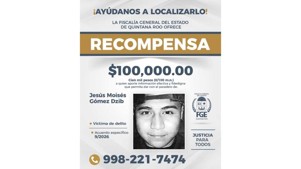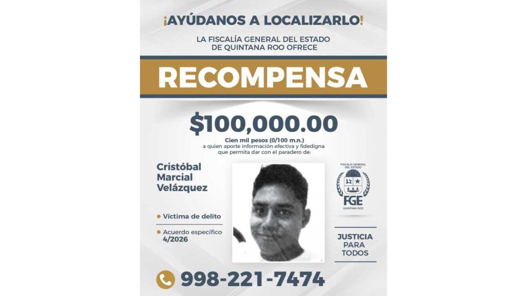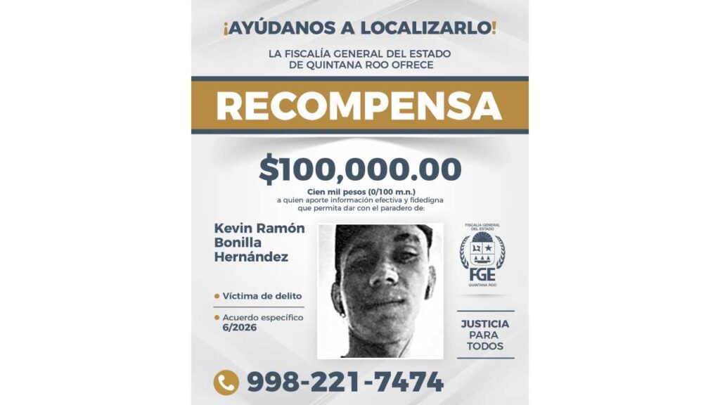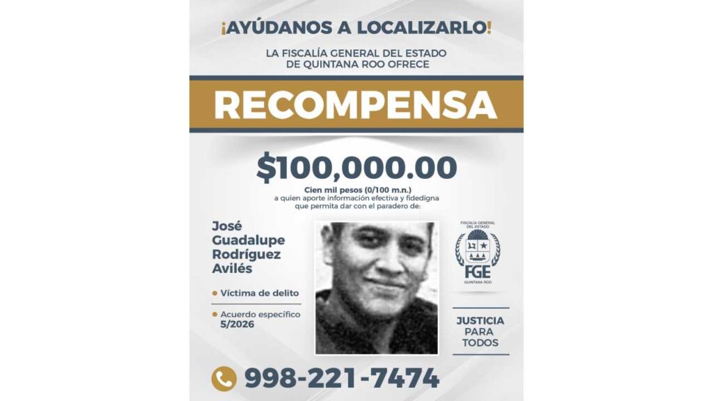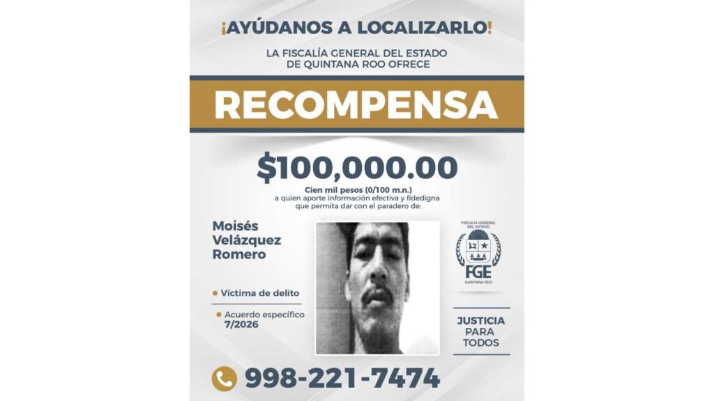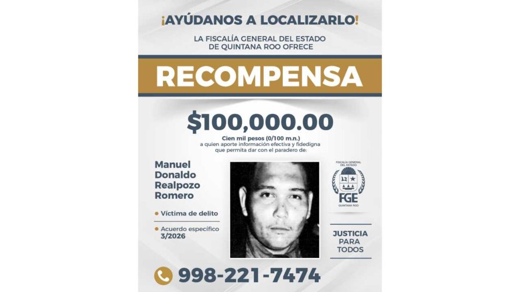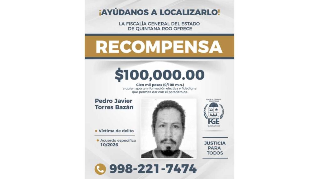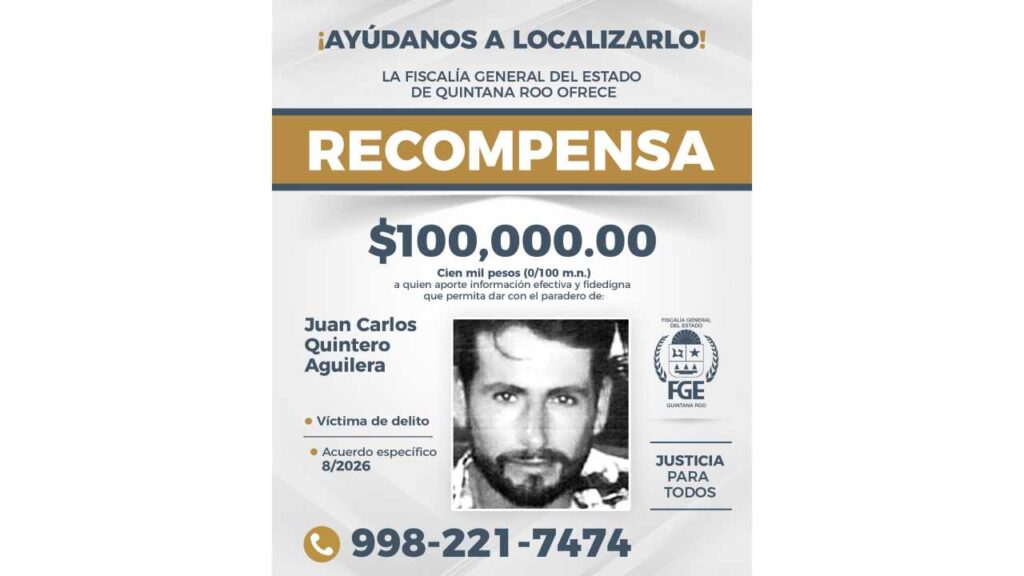 La Fiscalía de Quintana Roo anunció una recompensa de 100 mil pesos a quien proporcione información veraz y comprobable que permita localizar a ocho personas reportadas como desaparecidas en la entidad.