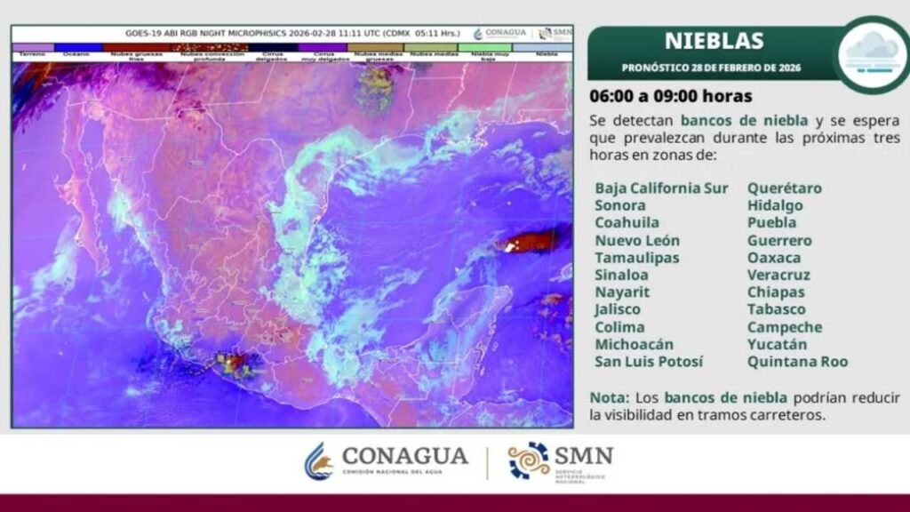 De 07:00 a 10:00 horas (tiempo de Quintana Roo) se detectan bancos de niebla en distintas zonas del estado, con reducción de visibilidad en tramos carreteros y áreas urbanas, de acuerdo con información del Servicio Meteorológico Nacional.