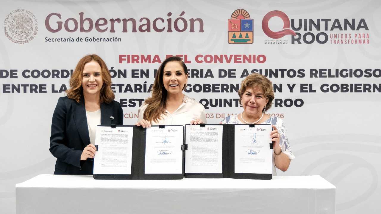La gobernadora encabezó en el C5 de Cancún la firma del Convenio de Coordinación en Materia de Asuntos Religiosos con la Secretaría de Gobernación, subrayando que la espiritualidad, en cualquiera de sus expresiones, forma parte de los derechos humanos fundamentales.