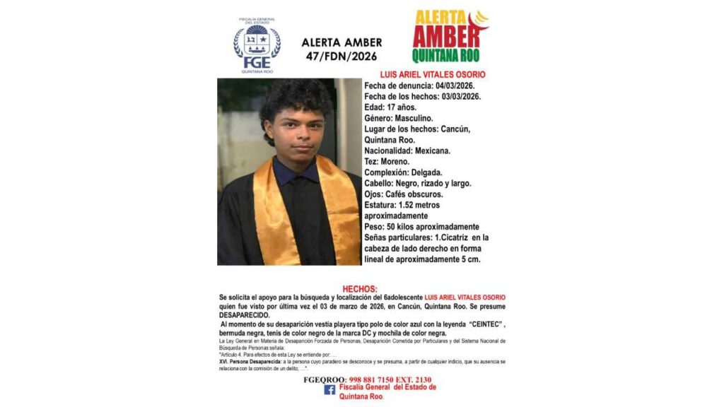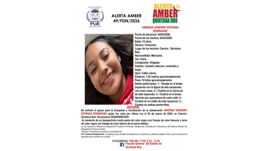 De acuerdo con la Fiscalía de Quintana Roo, la adolescente Vanessa Veneriny Estrada Rodríguez, de 15 años, fue vista por última vez el 4 de marzo de 2026 en Cancún.
