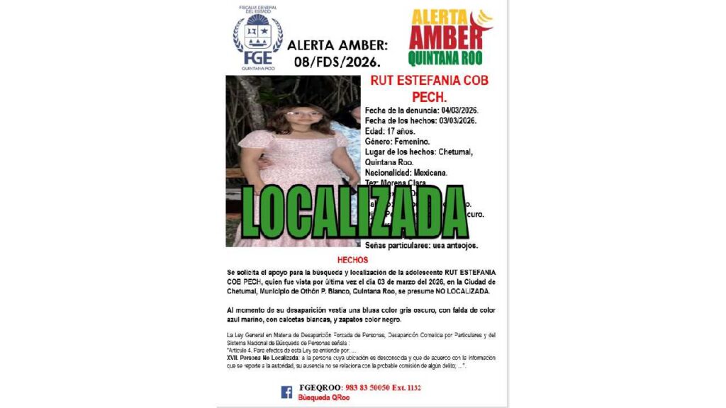 En otro caso, la autoridad ministerial informó que Rut Estefanía Cob Pech ya fue localizada, por lo que la ficha de búsqueda correspondiente fue desactivada.