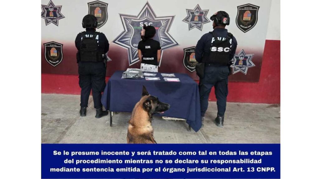 De acuerdo con el reporte oficial, el aseguramiento ocurrió cuando el canino Max detectó posibles narcóticos en las pertenencias de la joven, quien se encontraba junto a un agente de tránsito mientras era intervenida su motocicleta por una infracción en la colonia Proterritorio.