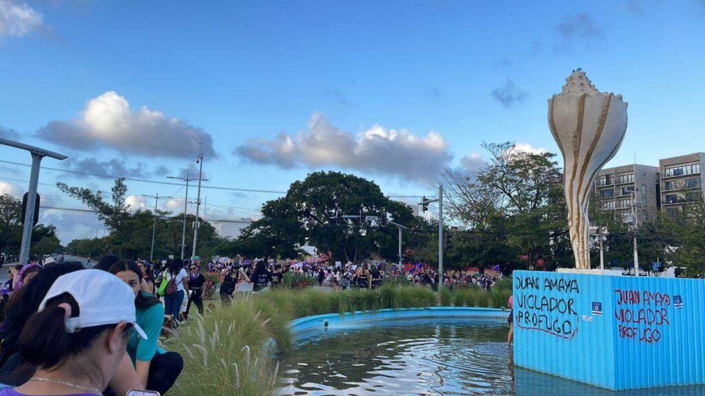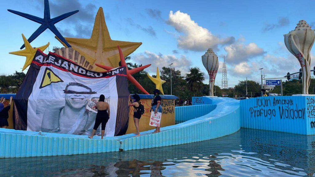 En la Glorieta del Ceviche se desplegó una manta con el rostro de un presunto agresor sexual, como forma de denuncia social, y se realizaron pintas en el monumento para exigir castigo a los responsables.