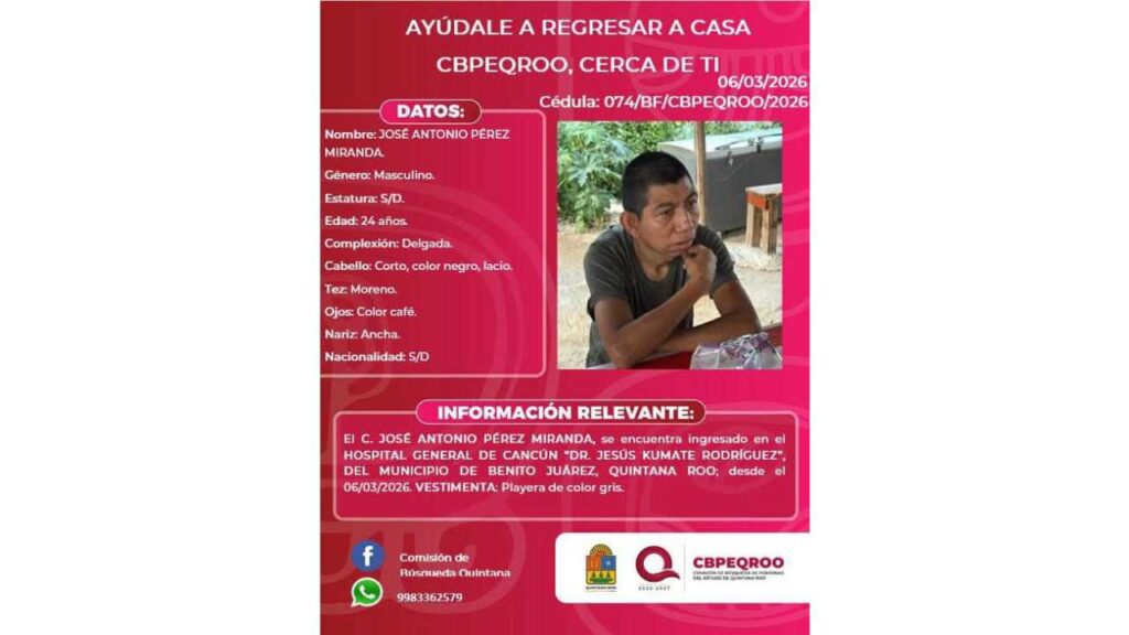 La Secretaría Municipal de Seguridad Ciudadana (SSC) de Isla Mujeres informó sobre la localización de un joven que contaba con ficha de búsqueda activa, luego de que se reportara su desaparición tras haber estado hospitalizado en la ciudad de Cancún.