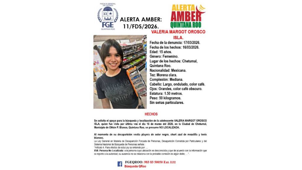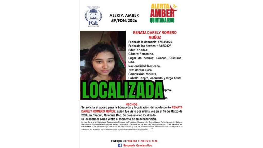 La Fiscalía General del Estado de Quintana Roo activó una ficha de búsqueda por la desaparición de una menor en Cancún, mientras que en un caso paralelo logró la localización de otra adolescente reportada como desaparecida.