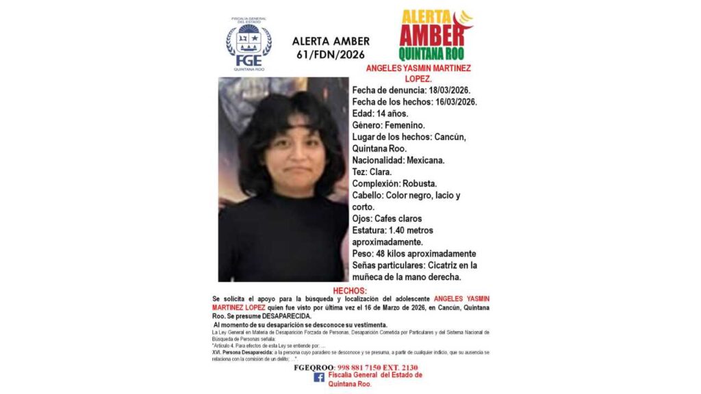 Las autoridades mantienen activa la búsqueda de Ángeles Jasmín Martínez López, de 14 años, quien fue vista por última vez el 16 de marzo de 2026 en Cancún.