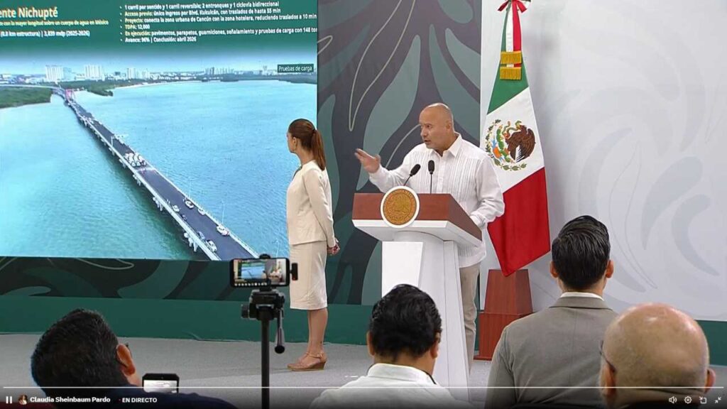 Como parte de este paquete de obras, el Puente Nichupté registra avances significativos y se encuentra en fase de pruebas de carga para garantizar su seguridad estructural.