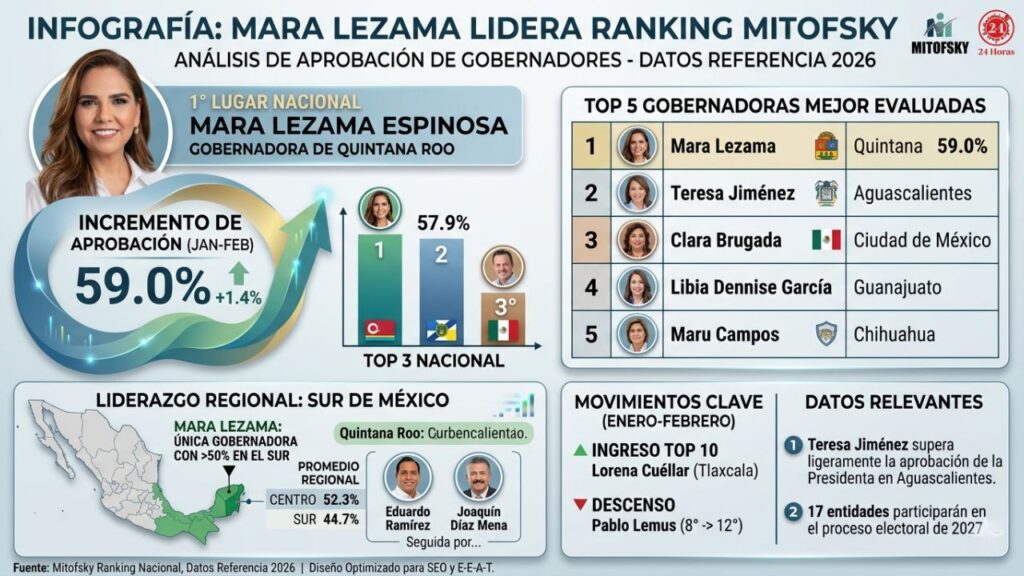 - Consistencia femenina: Mara Lezama encabeza también el bloque de las 13 gobernadoras en funciones, seguida por Teresa Jiménez (Aguascalientes) y Clara Brugada (CDMX).