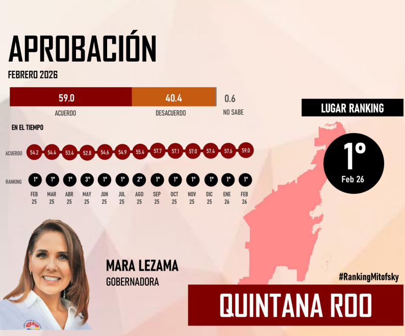 A 42 meses de haber iniciado su gestión, la gobernadora de Quintana Roo, Mara Lezama Espinosa, reafirma su liderazgo político al posicionarse nuevamente en la cima del ranking nacional de aprobación de gobernadores realizado por la casa encuestadora Mitofsky.