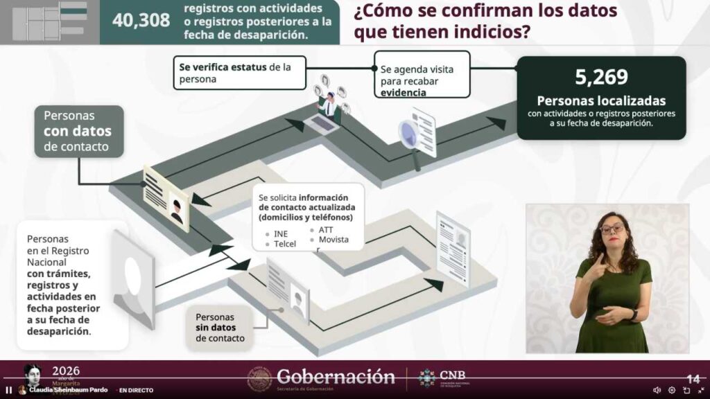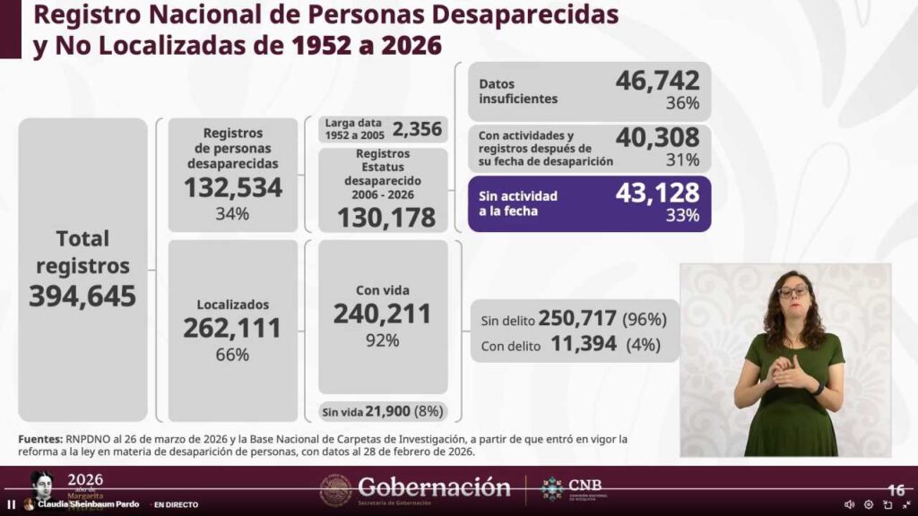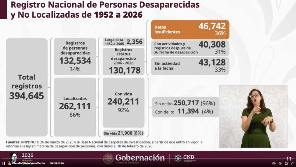 Pese a ello, el gobierno destacó que, en promedio, 66 de cada 100 personas reportadas como desaparecidas son localizadas, la mayoría sin relación con delitos.