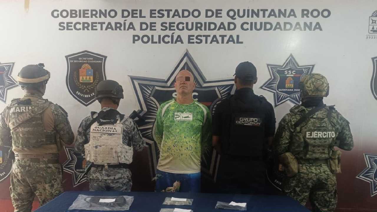 Elementos de seguridad detuvieron a un hombre en la avenida Huayacán, en Cancún, por su presunta participación en delitos contra la salud, tras ser sorprendido manipulando sustancias ilícitas en la vía pública.